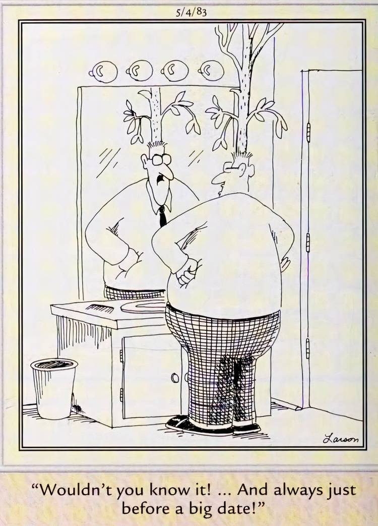 Si había algo por lo que Gary Larson era conocido, era usar esta franja para llamar a los defectos más grandes de la humanidad. Aquí, un hombre acaba de brotar un árbol de su cabeza. Lo que debería ser una preocupación alarmante es más como un inconveniente para el hombre, que está molesto ya que tiene una cita.