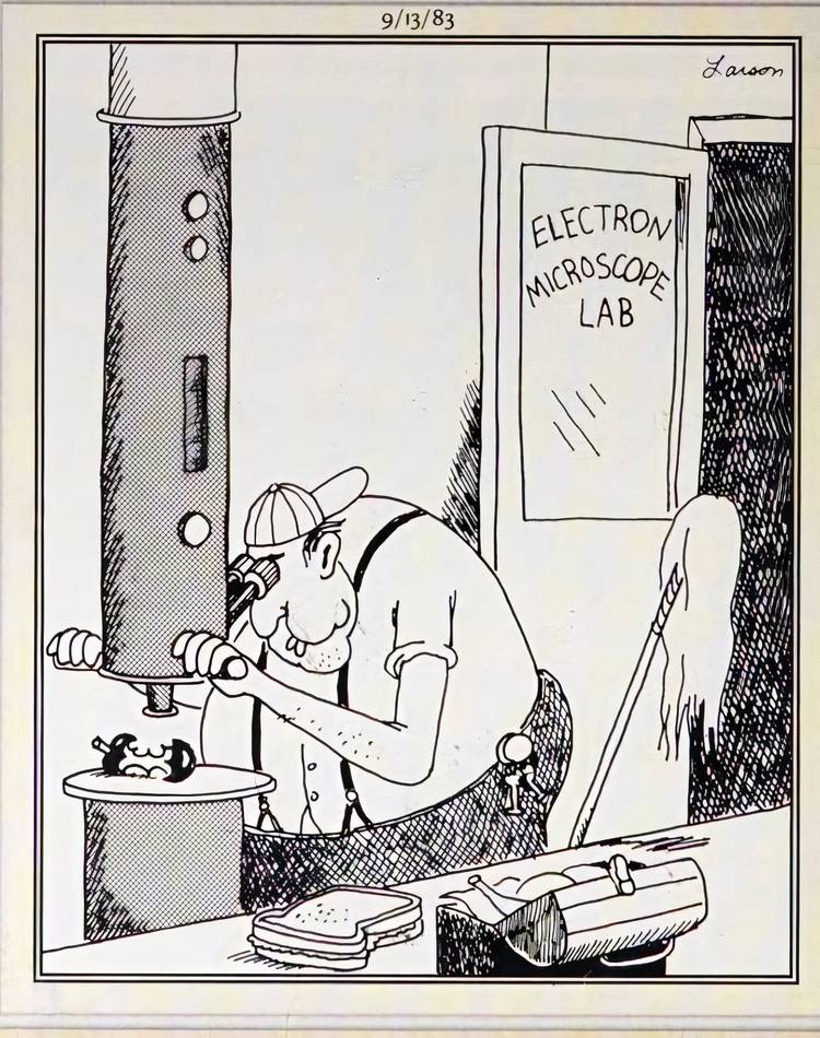 El lado lejano La falta de fe en las personas ciertamente hizo muchos chistes increíblemente divertidos. En esta tira, un custodio está tomando un descanso de la limpieza de un laboratorio que contiene un microscopio electrónico. El hombre, curioso por ver qué puede hacer el elegante equipo, lo usa para mirar dentro de una manzana en la que está comiendo.