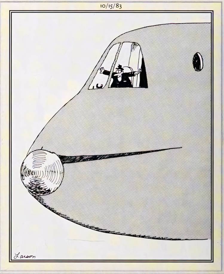 El lado lejano Le encanta jugar con los lectores, siempre zigzagueos cuando la gente espera un zag. Larson subvierte las expectativas de las personas de manera experta en esta franja. Tiene todos los ingredientes para una franja lejana, incluidos todos sus personajes locos. Pero todos están juntos sin un escenario particular y una nota informa al lector que la tira está fuera de servicio.