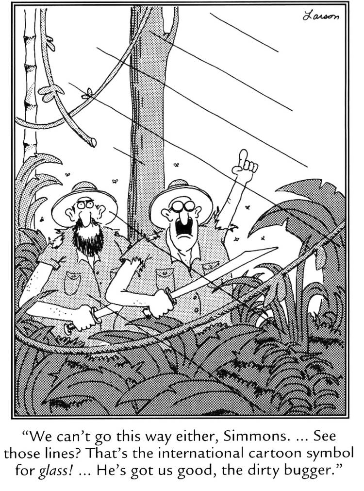 Como la mayoría de los fanáticos pueden dar fe, El lado lejano siempre está en su mejor momento cuando utiliza meta humor. Aquí, Larson muestra a un par de exploradores que se abren camino a través de un matorral, solo para descubrir el símbolo del dibujante para el vidrio y se dan cuenta de que se han quedado atrapados en una tira cómica.