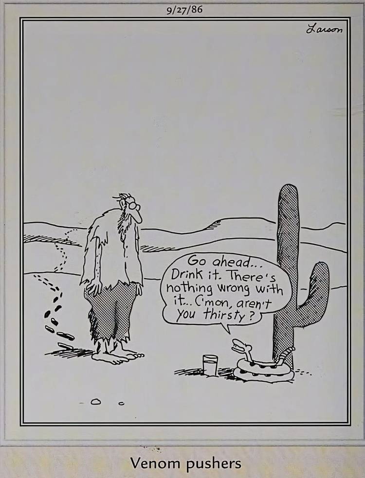 Este Lado lejano El cómic también tiene connotaciones bíblicas, como una serpiente que intenta atraer a un alma inocente con algo tentador se hace eco de la visual de una serpiente luciferiana que ofrece a Eva la manzana. Con suerte, este Adam piensa dos veces antes de aceptar cualquier oferta de una serpiente, o beber un líquido que pueda o no ser venenoso.
