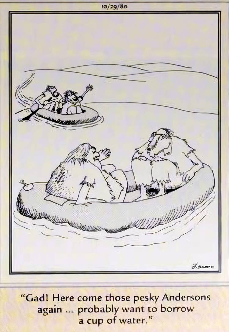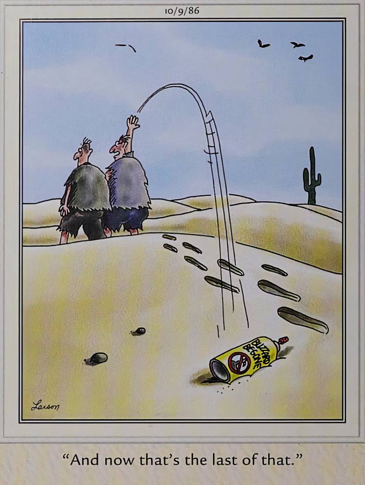 El creador del lado lejano Gary Larson frecuentemente regresó a los primeros días de civilización para celebrar el origen de las mayores innovaciones de la especie.