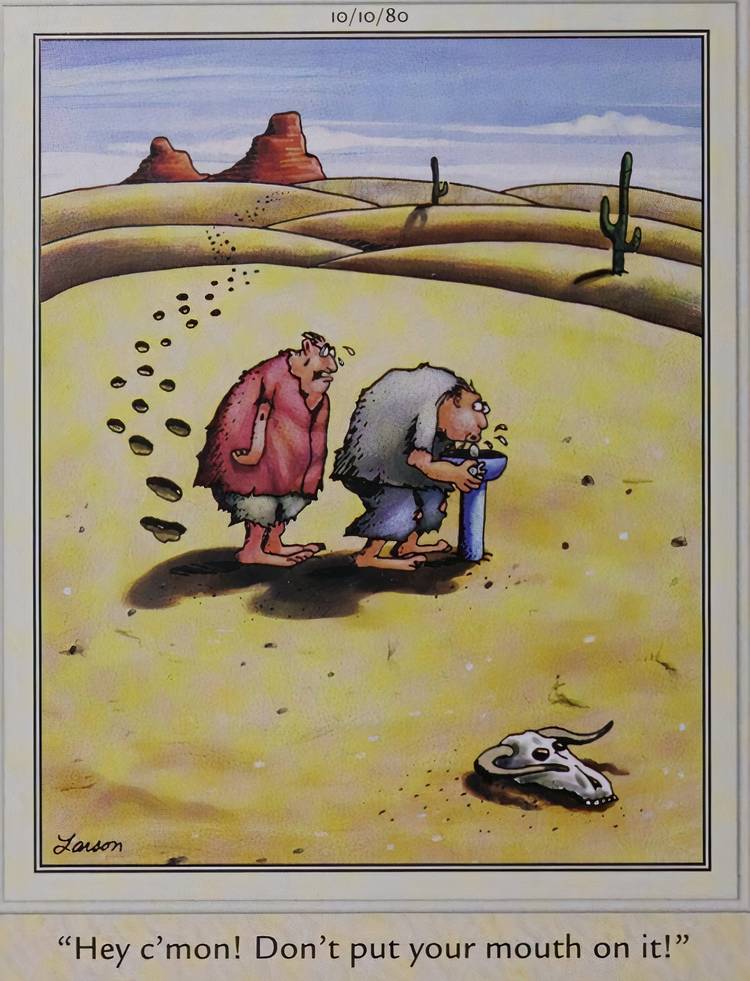En tiempos de perderse, para evitar que la situación empeore, es importante mantener la calma en todo momento y mantener el decoro. Estos dos caballeros tienen la idea correcta. A pesar de estar calientes, cansados y deshidratados, tienen suficiente decencia para no empujar y meter una línea para dos. En cambio, se alinean de manera ordenada frente a la fuente de agua. Desafortunadamente, Al menos uno de estos caballeros carece de la decencia de no poner la boca en la fuente.