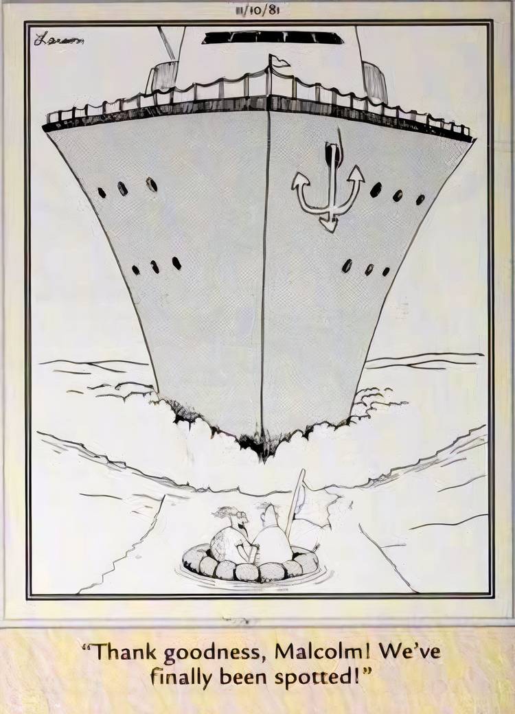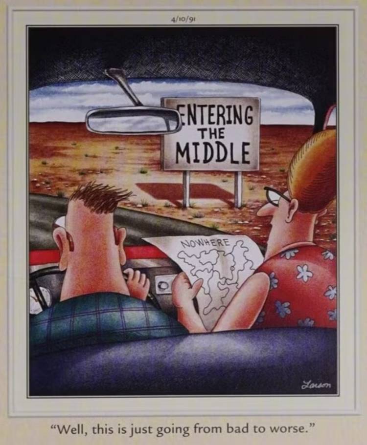 No hay nada peor que el momento en que la realidad se dedica a perderse. Los alrededores familiares comienzan a sentirse desconocidos, y ya no coinciden con ninguna de las coordenadas para el destino previsto. No podría ser más dolorosamente obvio que uno se perdió que si se explicara para ellos. Entonces, Gary Larson es exactamente lo que parece cuando todos los signos apuntan a la mitad de la nada. Es un medio irónico para ilustrar esa sensación universal de perderse.
