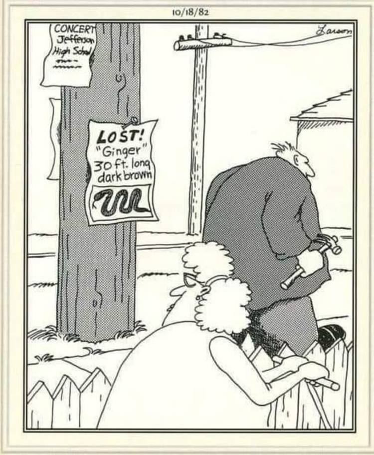 Cómo se hace atrapar y devolviendo una serpiente de 30 pies de largo Para su dueño, especialmente sin collar, es una suposición de nadie. Este es otro ejemplo de cómo Gary Larson hizo que sus lectores reflexionen sobre preguntas difíciles.