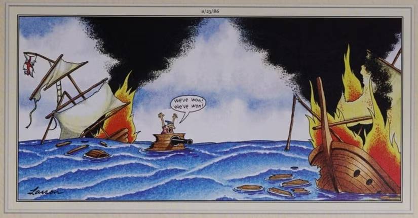 Esta es una forma única de perderse, una que está en capas de complejidad. El hombre en cuestión es el último sobreviviente de lo que parece ser una guerra violenta, un conflicto en el que ambos lados perecen, excepto por él. Todavía, Todavía grita, “¡Ganamos!” Aunque ya no hay “nosotros” hablar de. Si bien este momento es innegablemente divertido, también es una de las entradas más oscuras de Gary Larson en su serie icónica. De hecho, incluso podría considerarse extrañamente relevante para el mundo actual.