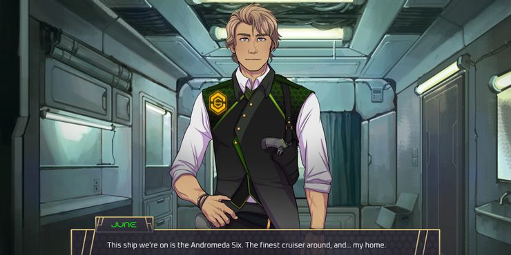 Otro simulador de citas gratuito en itch.io que definitivamente vale la pena jugar es Andrómeda seis. El juego sigue a un viajero amnésico que se despierta en una nave espacial llamada Andromeda Six. Mientras persigue a uno de los personajes principales o permanece soltero, el viajero intenta descubrir la verdad sobre su pasado. La mayoría de las opciones del juego tienen palabras entre paréntesis que indican el tono, lo cual es útil porque puede ser difícil conocer el significado completo de una frase solo con palabras en cualquier novela visual.