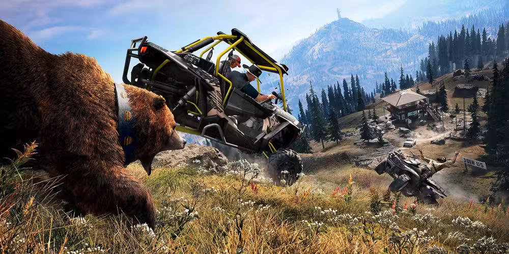 Muy lejos 5 Te deja caer de cabeza desde un helicóptero hacia el hermoso y accidentado condado de Hope, Montana. A primera vista, los paisajes engañosamente hermosos parecen orgánicos, con ríos sinuosos, bosques densos y hermosas vistas a las orillas del lago. Sin embargo, arrastrándose entre esos árboles hay vida silvestre mortal, cultistas psicóticos y mucho caos.. La libertad es clave, ya que puedes derribar puestos de avanzada, eliminar líderes de sectas o simplemente dejarlo todo por la pesca.