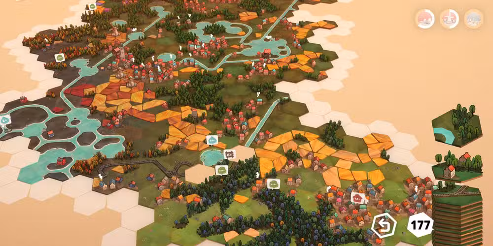 Si eres principiante en desde Dorfromla mecánica del juego es sencilla. Es un juego de colocación de fichas hexagonales en el que hay una variedad de tipos de terreno y elementos como vías de ferrocarril, ríos y pueblos. Cuando colocas una ficha, intentas conectar terrenos similares, como juntar piezas de bosque o combinar campos. El mundo que creas es sereno y tus puntos provienen de las regiones conectadas.