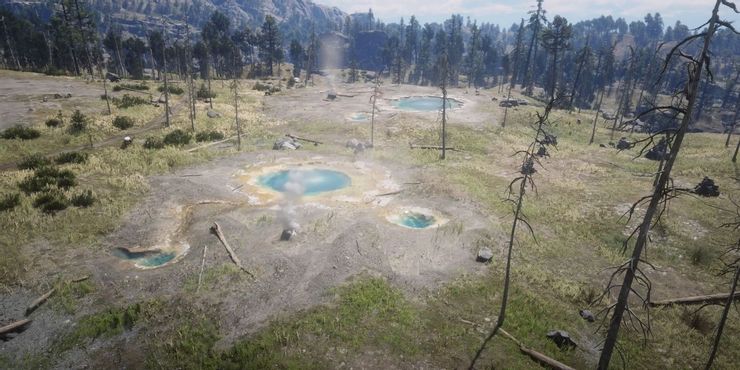 Esta formación hidrotermal de piscinas y géiseres se encuentra en la región Grizzlies East del territorio Ambarino. Las deslumbrantes piscinas de color amarillo verdoso de agua calentada naturalmente en esta área apartada otorgan una sensación igual de intimidad y lujo. Caballos salvajes y bandas de alces deambulan cerca mientras los géiseres estallan ocasionalmente.
