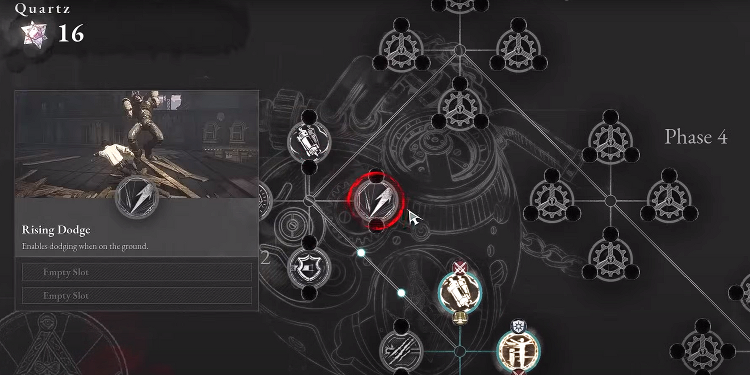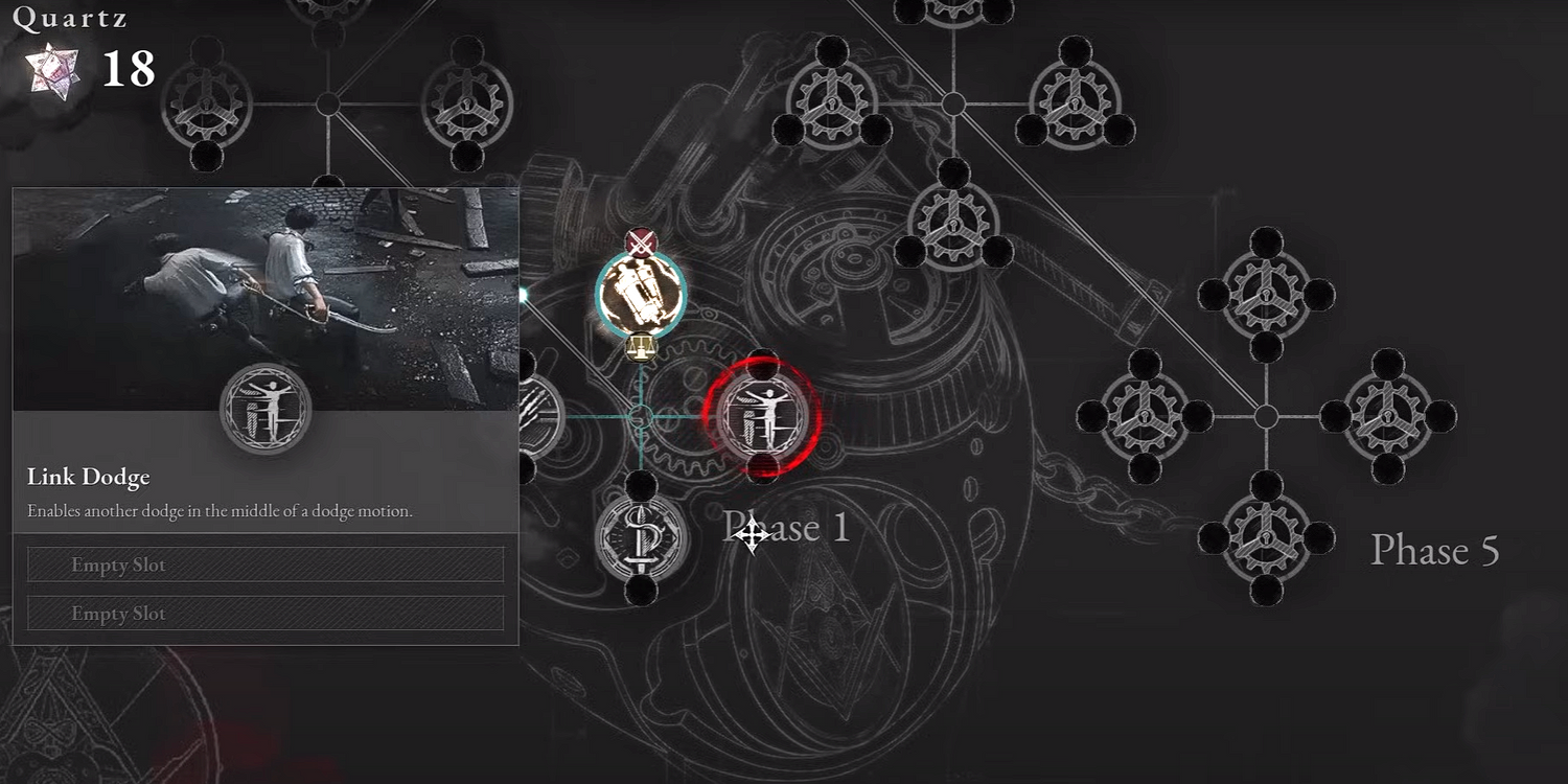 Enlace Dodge es un Fase 1 habilidad, y es una de las actualizaciones más útiles. Hay muchas situaciones en las que es útil tener una esquiva extendida, y ciertos jefes en Mentiras de P Será mucho más difícil evitarlo sin él. El Link Dodge permite otra esquiva mientras ya estás en medio de uno, y te costará 2 Cuarzo para desbloquearlo.