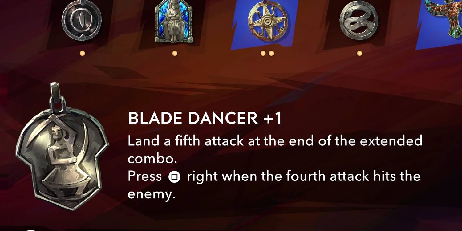 Otro amuleto de dos ranuras es Bailarín de espada, lo que añade otro golpe al final del combo de ataque permanente de Sargón. Cuando atacas el suelo, tu último ataque en una secuencia combinada es un gran corte giratorio que derriba a los enemigos y causa un daño significativo. Equipar este amuleto agrega otro corte giratorio que puedes realizar inmediatamente después de realizar el remate normal en Príncipe de Persia: La corona perdida.
