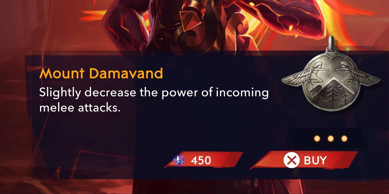 Monte Damavad es un amuleto de tres espacios que se vende en Kaheva’s Forge por 450 cristales de tiempo y ofrece una excelente protección por el costo de casi todos los espacios del collar de Sargón. Incluso si tienes cinco o más espacios disponibles, es posible que solo puedas tener algunos otros amuletos después de equipar este. Mount Damavand te brinda resistencia a los ataques cuerpo a cuerpo, lo que puede ser útil si aún necesitas mejoras de salud de Soma Petals.