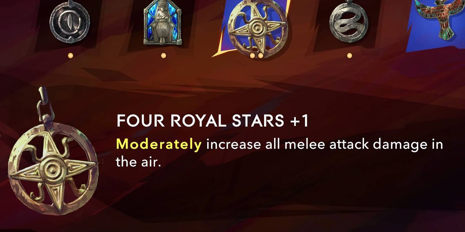Una vez que empieces a recolectar plumas de Simurgh que te dan más movilidad en el aire, el poder de este amuleto se vuelve más útil. Una carrera aérea especial que obtienes después de derrotar a Manticore abre nuevas posibilidades para tus patrones de ataque en el aire. Más ataques mientras estás en el aire significa que el beneficio de las Cuatro Estrellas Reales podría aplicarse a cadenas combinadas más largas que armes contra un enemigo lanzado en Príncipe de Persia: TLC.