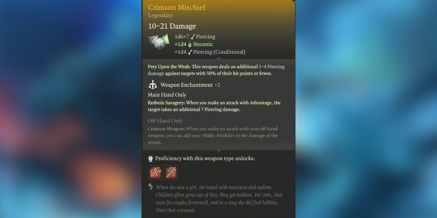 “/> Crimson Mischief es una de las dos armas que se pueden obtener después de derrotar a Orin en el Acto 3 de BG3. Ofertas de Travesuras Carmesí 1d6 más daño perforante y 1d4 de daño necrótico, y 1d4 extra de daño perforante si el objetivo tiene menos del 50% de sus puntos de vida.. Además de eso, esta espada corta tiene diferentes propiedades según si es el arma de la mano principal o la secundaria. En la mano principal de un personaje, causará siete daños adicionales si el ataque se realizó con ventaja. Como arma secundaria, Crimson Mischief permite agregar el modificador de habilidad del personaje al daño sin necesidad del estilo de lucha con dos armas.