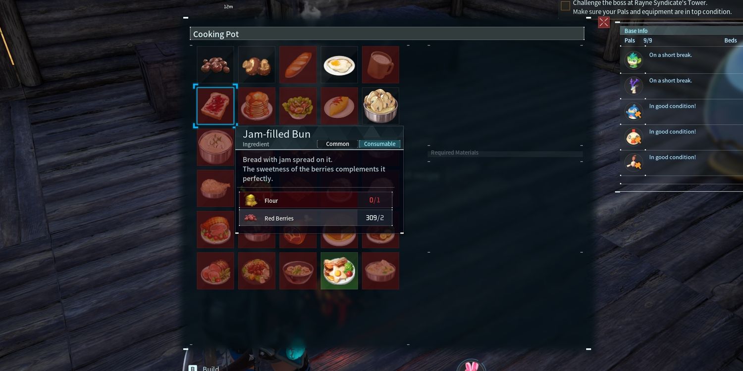 La receta requiere dos Frutos Rojos y una unidad de Harina. Para el primero, puedes cultivar o recolectar las bayas. Este último se puede comprar a un comerciante errante o crearse usando el molino para moler trigo en mundo pal. La receta de pan relleno de mermelada se puede desbloquear en el nivel 17.