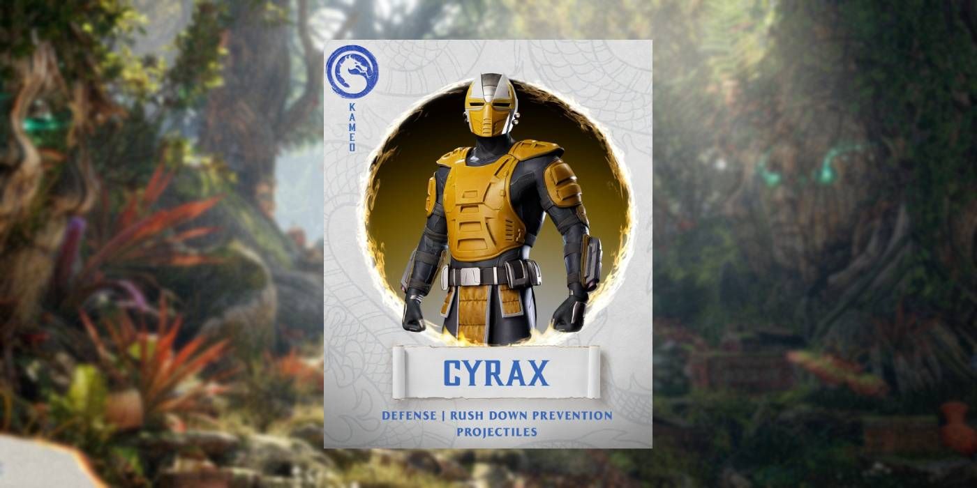 El miembro reacio de la Iniciativa Cibernética incorpora tecnología muy avanzada a sus ataques Kameo, siendo el más frecuente su red verde que atrapa a los oponentes en un combo completo. Mientras que la auto destrucción La asistencia puede dañar tanto a tu personaje como a tu oponente, este movimiento arriesgado se mejora a través de la sierra circular Ataque de emboscada. Si se mantiene presionado el botón Kameo, Cyrax gira hacia adelante para dar muchos golpes a la vez que cubren una gran cantidad de espacio.