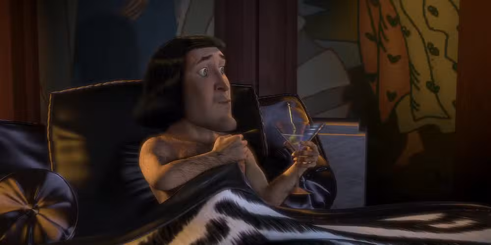 Farquaad se sorprende de repente y echa un vistazo rápido debajo de las sábanas.acercándolos a su pecho. Es una broma sutil que no significará nada para el público más joven y que incluso los espectadores adultos pueden pasar por alto fácilmente, pero una vez que te das cuenta, es difícil no ver lo que Farquaad está haciendo realmente.