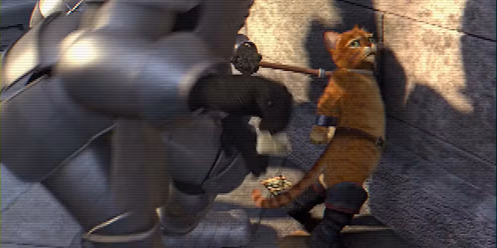 El gato está apoyado contra una pared y Uno de los caballeros confisca una bolsa de hierba gatera de su cinturón.que el Gato dice que no es suyo. en el mundo de shrekla hierba gatera puede ser tan mala como las sustancias ilícitas, pero afortunadamente, el Gato no enfrenta más problemas relacionados con esa bolsa de hierba gatera.