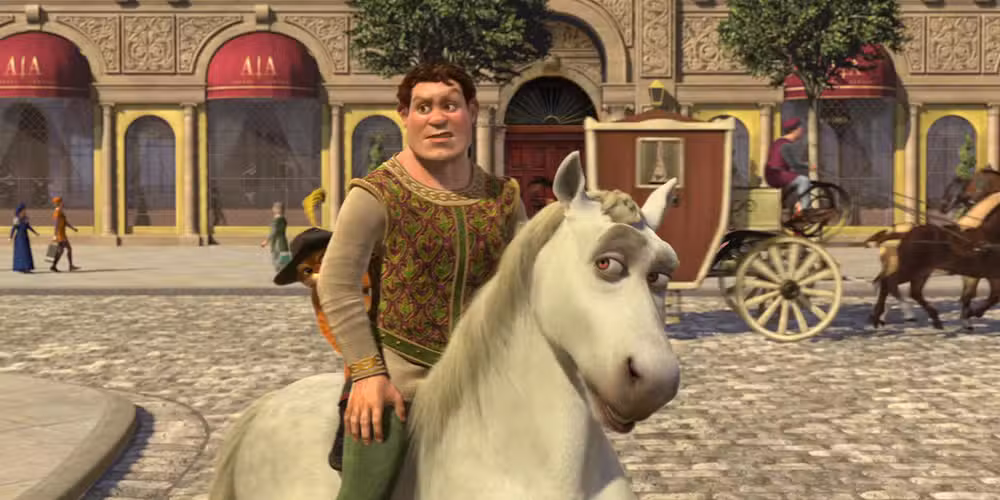 Antes de la pimienta y la hierba gatera, hay un chiste muy rápido, algo sutil y muy fácil de pasar por alto al comienzo de Caballeros. Se escucha la voz de uno de los caballeros que solicita refuerzos, diciendo que tienen un “bronco blanco dirigiéndose hacia el este hacia el bosque”, refiriéndose al apuesto Shrek montado en un apuesto burro, un caballo blanco.