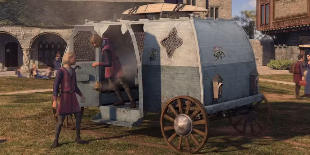 shrek tercero ve a Shrek, Donkey y Puss en una misión para encontrar al primo de Fiona, Arthur (Justin Timberlake), para que pueda tomar el trono de Far Far Away. Lo encuentran en la Academia de Worcestershire y, una vez allí, pasan junto a un carruaje que parece una vieja furgoneta Volkswagen de los años 60, pero de estilo medieval, por supuesto.