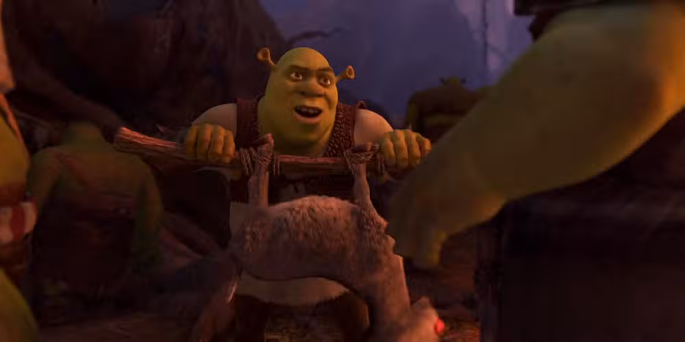 Antes de que aparezca Fiona y Shrek mencione el “wafflehole”, Donkey hace un gran chiste que no recibe suficiente atención (principalmente porque suceden muchas cosas cuando lo dice). Los ogros cargan a Burro con la intención de cocinarlo.con Shrek tratando de convencerlos de que no lo hagan.