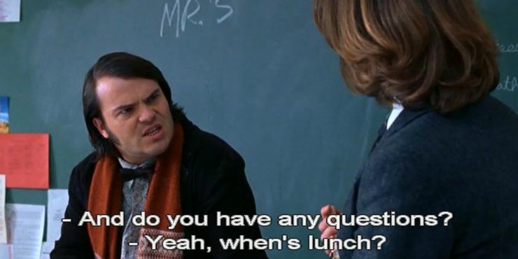 Toda la secuencia con Dewey llegando a la escuela está llena de líneas e interacciones memorables. Después de ser presentado a los niños, el director Mullins le pregunta a Dewey si tiene alguna pregunta. Sin dudarlo, se vuelve hacia ella y le pregunta: “Sí, ¿cuándo es el almuerzo?”, Sus prioridades son evidentemente obvias.
