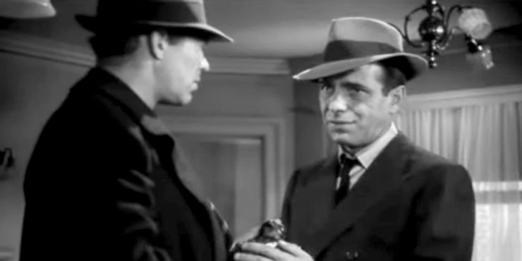 Sam el detective privado Espadas evaluación de una estatua de valor incalculable después del cine negro de John Huston El halcón maltés.
