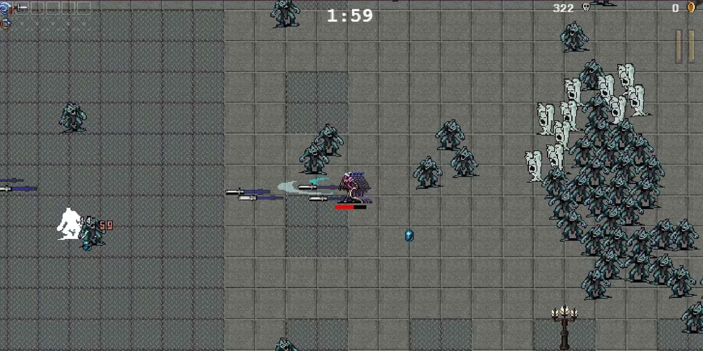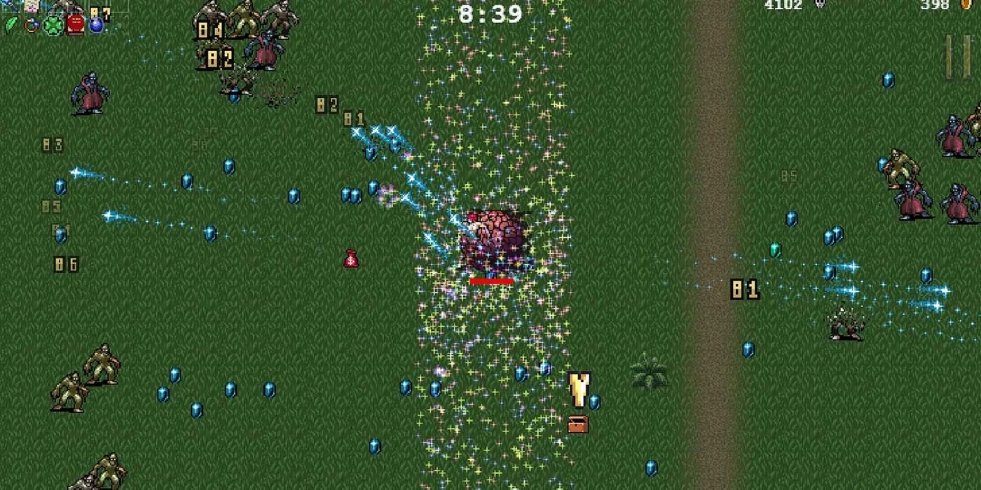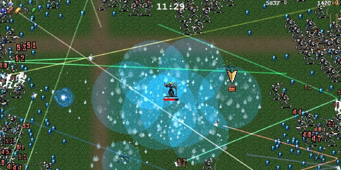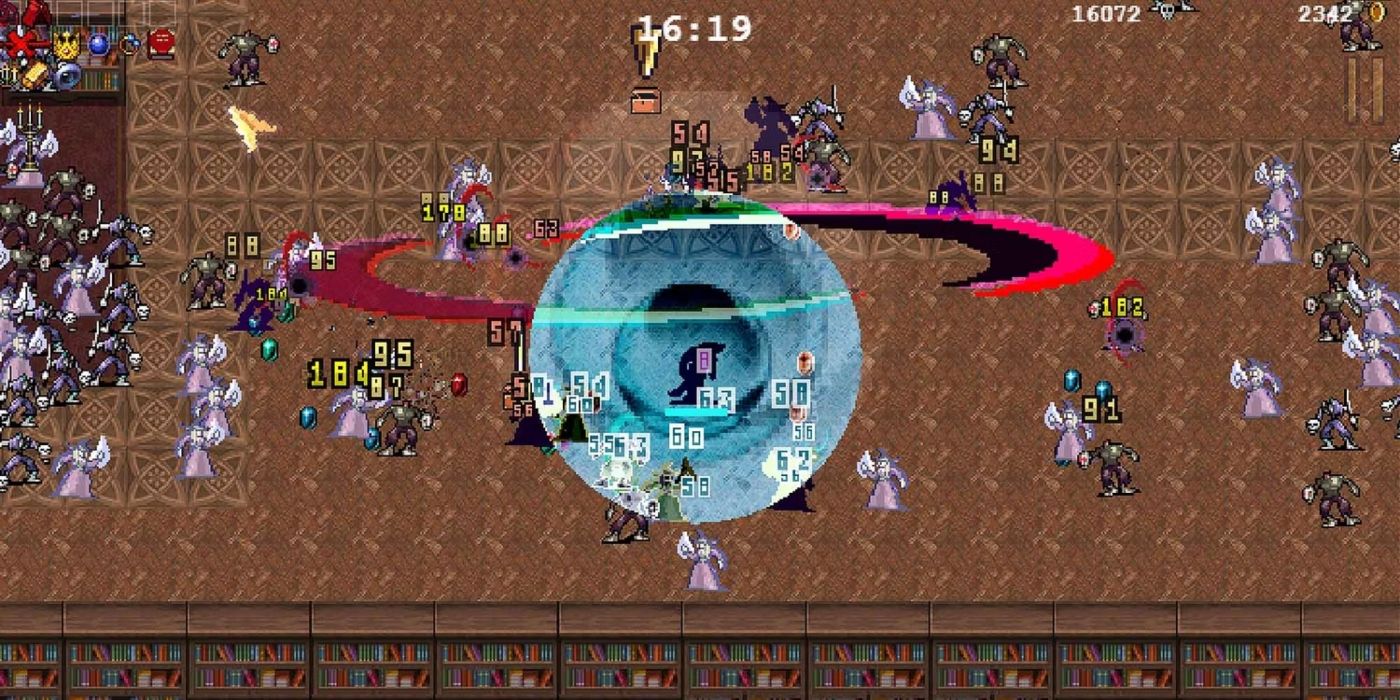 Esta combinación de armas en Supervivientes de vampiros Puede que inicialmente no sea obvio para los jugadores, pero funcionan bien juntos. Santa Water comienza como una de las peores armas del juego, pero cuando evolucionó a La Borra, se convierte en una de las mejores. La Borra crea charcos dañinos alrededor del superviviente en el centro de la pantalla. El Runtracer es excelente porque atraviesa enemigos y rebota en las paredes. Esto debilita a los enemigos antes de que finalmente sean derrotados al recibir daño de La Borra.