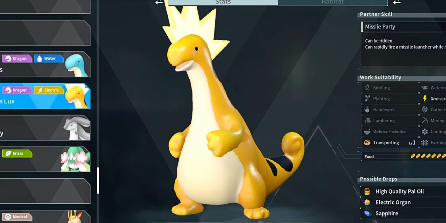 “/> Relaxaurus Lux es el amigo de fusión eléctrica de Relaxaurus en mundo pal. Ambos son adorables criaturas con apariencia de dinosaurio y un temperamento protector. Es un socio muy fuerte y tiene la capacidad de disparar cohetes cuando está equipado con los elementos correctos. Utiliza muchos Proyectil de tipo eléctrico ataques para derrotar a los enemigos. Él genera mucha electricidad para su base y es una fuente de aceite Pal de alta calidad cuando sea necesario.