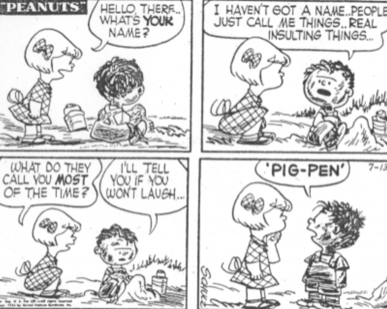 Los orígenes de Pig Pen se exploran en esta introducción. Miseria banda. Cuando Patty conoce a Pig Pen por primera vez, le pregunta al pequeño cómo se llama. Duda y se da cuenta de que normalmente lo llaman cosas malas, hasta que finalmente revela cómo lo llama la mayoría de la gente: Pig Pen. En realidad, nunca se ha dado ningún otro nombre para Pig Pen, ni el primero ni el último, por lo que si bien este nombre puede no ser el apodo más dulce, es todo lo que el público debe usar. Para ser justos, Pig Pen comparte la responsabilidad de su apodo y se enorgullece de su apariencia sucia y sucia.