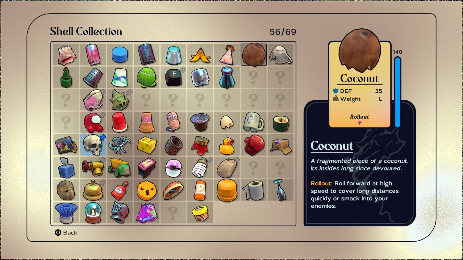 La cáscara de coco, aunque no es una de las mejores cáscaras en general, es Uno de los mejores Shells que los jugadores pueden obtener al principio del juego.. Se puede encontrar en la primera zona, The Shallows, más concretamente en la zona de Slacktide. Este Shell ofrece una defensa de 35 con una durabilidad decente. Si bien es un caparazón grande, lo que significa un movimiento más lento, También es el primer Shell Kril que encontrará y que ofrece la habilidad Rollout. algo que puede ayudar a cruzar grandes distancias rápidamente y es una excelente manera de encargarse de los enemigos.