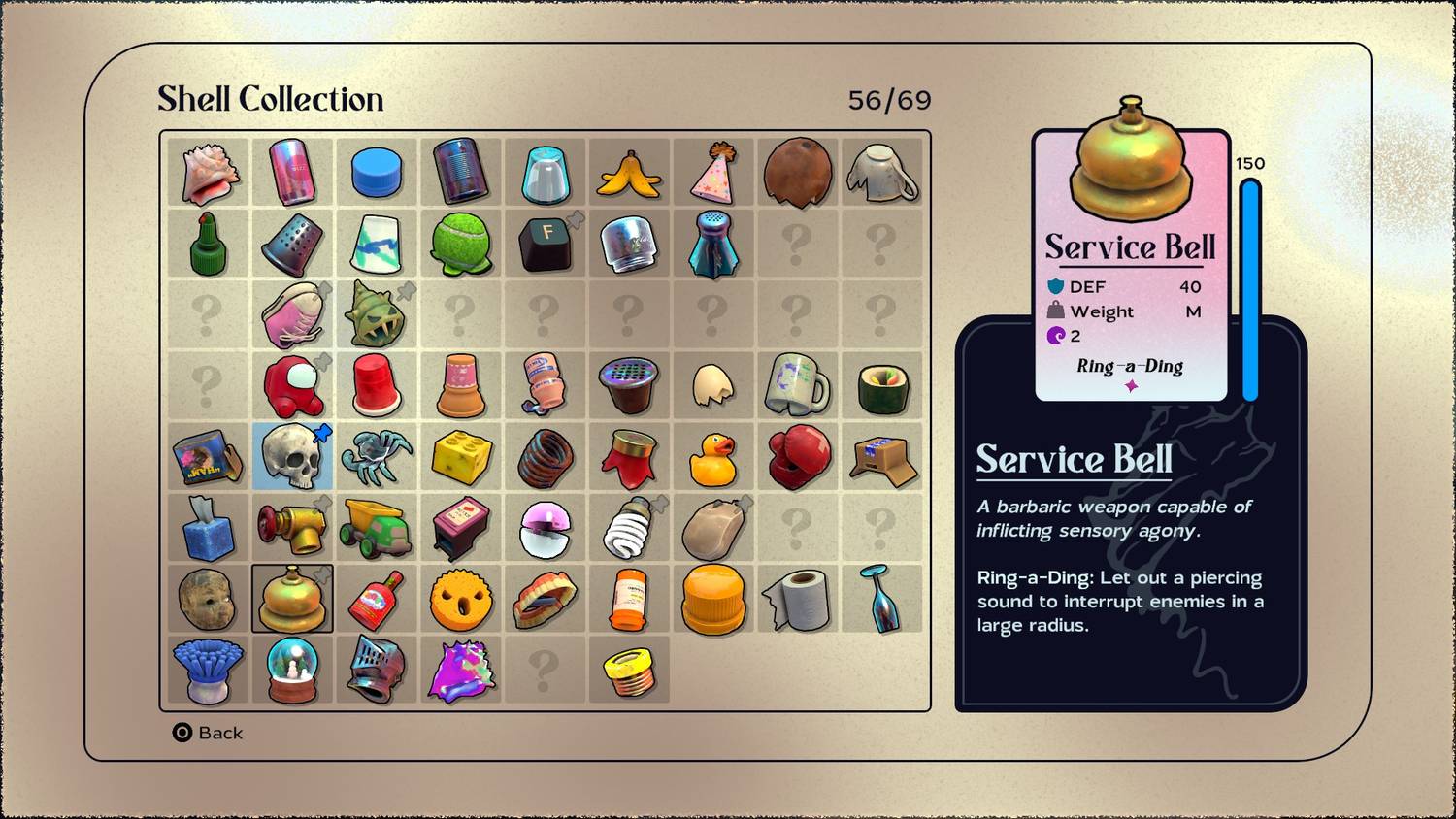 Mientras explora The Unfathom, Kril se verá obligado a explorar un largo tramo del océano sin acceso a una concha de caracol lunar. Desafortunadamente, esto significa que no podrá utilizar su seguro Shell, lo que significa que si pierde el Shell con el que entra, se verá obligado a utilizar lo que esté disponible. En este caso, una de las mejores opciones que existen es Service Bell. Tiene buenas defensas y una estadística de MSG +2 y presenta la habilidad Ring-A-Ding, que le permite interrumpir a los enemigos que rodean a Kril y aturdirlos momentáneamente. Esta habilidad puede ser increíblemente útil, especialmente en esta área oscura, donde los jugadores probablemente estarán más nerviosos.