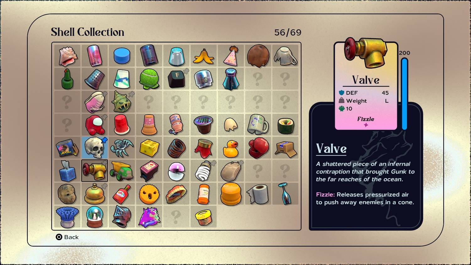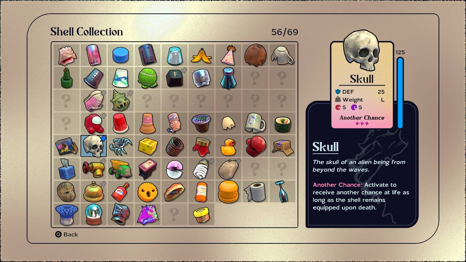 Hay 69 conchas diferentes para coleccionar. El tesoro de otro cangrejo. Cuando se abre el juego, comienza el conflicto y uno de los factores impulsores de la trama es que Kril ha recuperado su caparazón y anhela recuperarlo. A partir de entonces, Kril debe viajar por el océano, equipando todo lo que pueda encontrar hasta poder recuperar su caparazón original.