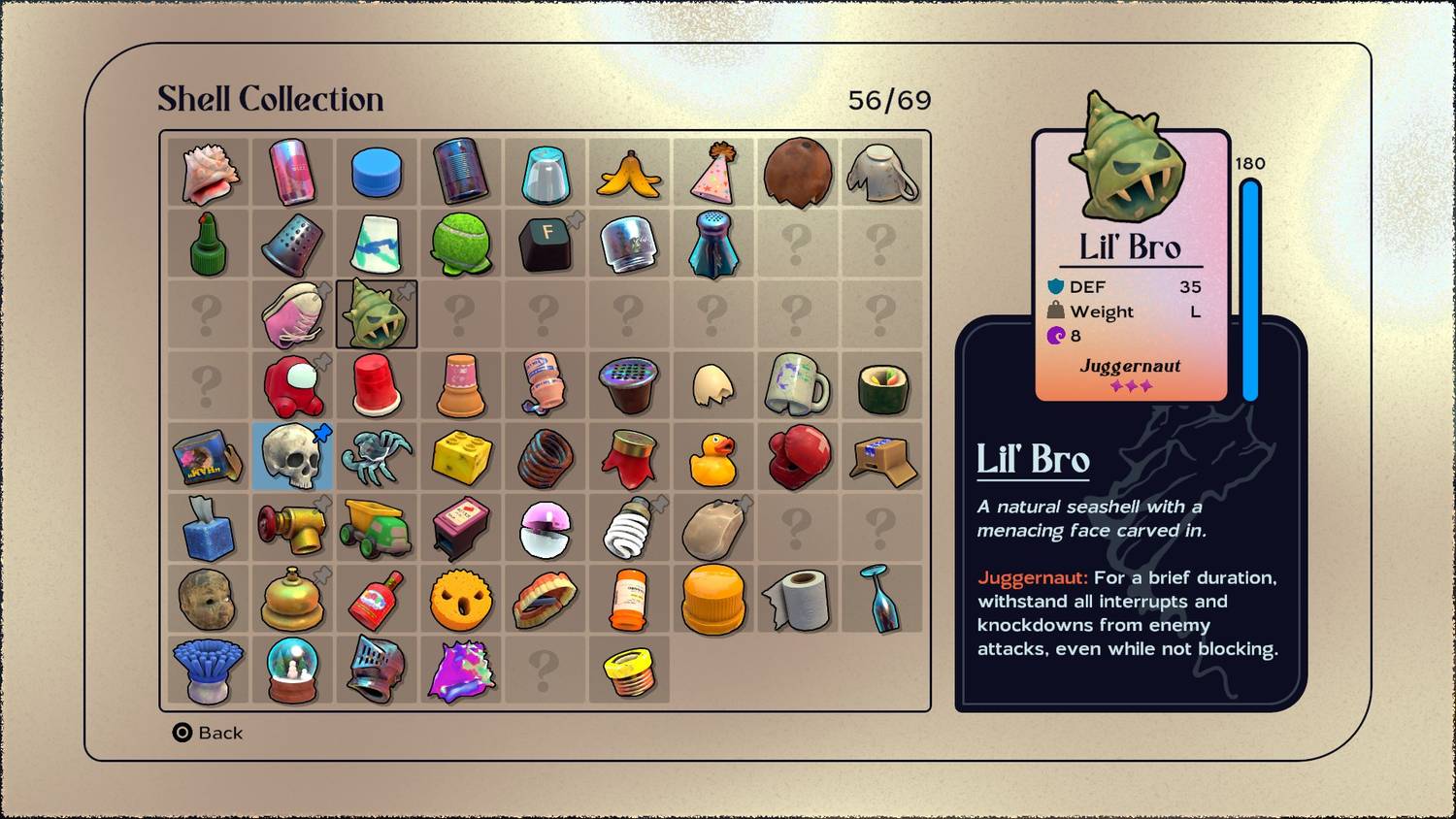 Aunque hay varias opciones disponibles en Shellfish Desires en New Carcinia, una de las mejores y más baratas opciones disponibles es Lil’ Bro. Este caparazón no solo recuerda a la cola del querido Pokémon Slowbro, sino que también sirve como un excelente caparazón pesado al principio del juego. Tiene una defensa base de 35 y es parte de la categoría de peso grande para Shells. Además de sus defensas básicas, también ofrece Kril +8 MSG y la habilidad Juggernaut. Juggernaut le permite a Kril recibir golpes y resistir interrupciones por un corto período, incluso sin bloquear primero.