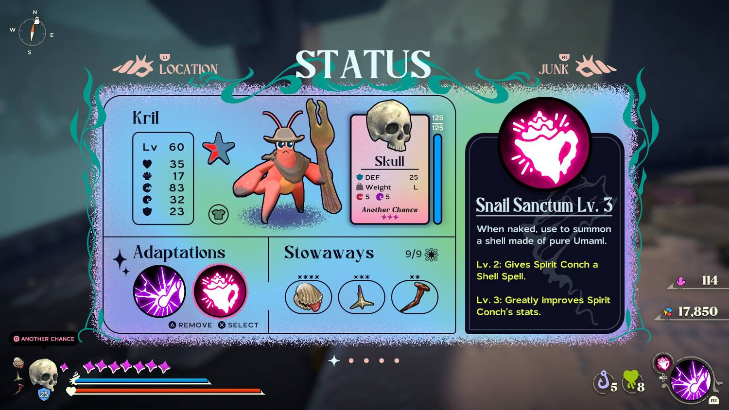 Después de derrotar a Petroch, Kril obtendrá la adaptación Snail Sanctum. Esta habilidad le permite a Kril invocar un caparazón hecho de Umami cada vez que no tiene uno. Además, si Kril está en medio de una pelea con un jefe y muere, puede reaparecer allí y recuperar su caparazón y otros elementos. Dado que el Spirit Shell no reaparece de esta manera, simplemente reaparecerá el último Shell que habías equipado antes de usarlo. Esto significa que, en lugar de tener que reiniciar la pelea desnudo, Kril podrá comenzar la pelea de nuevo con su Shell anterior y aún tener acceso al Spirit Shell nuevamente después.