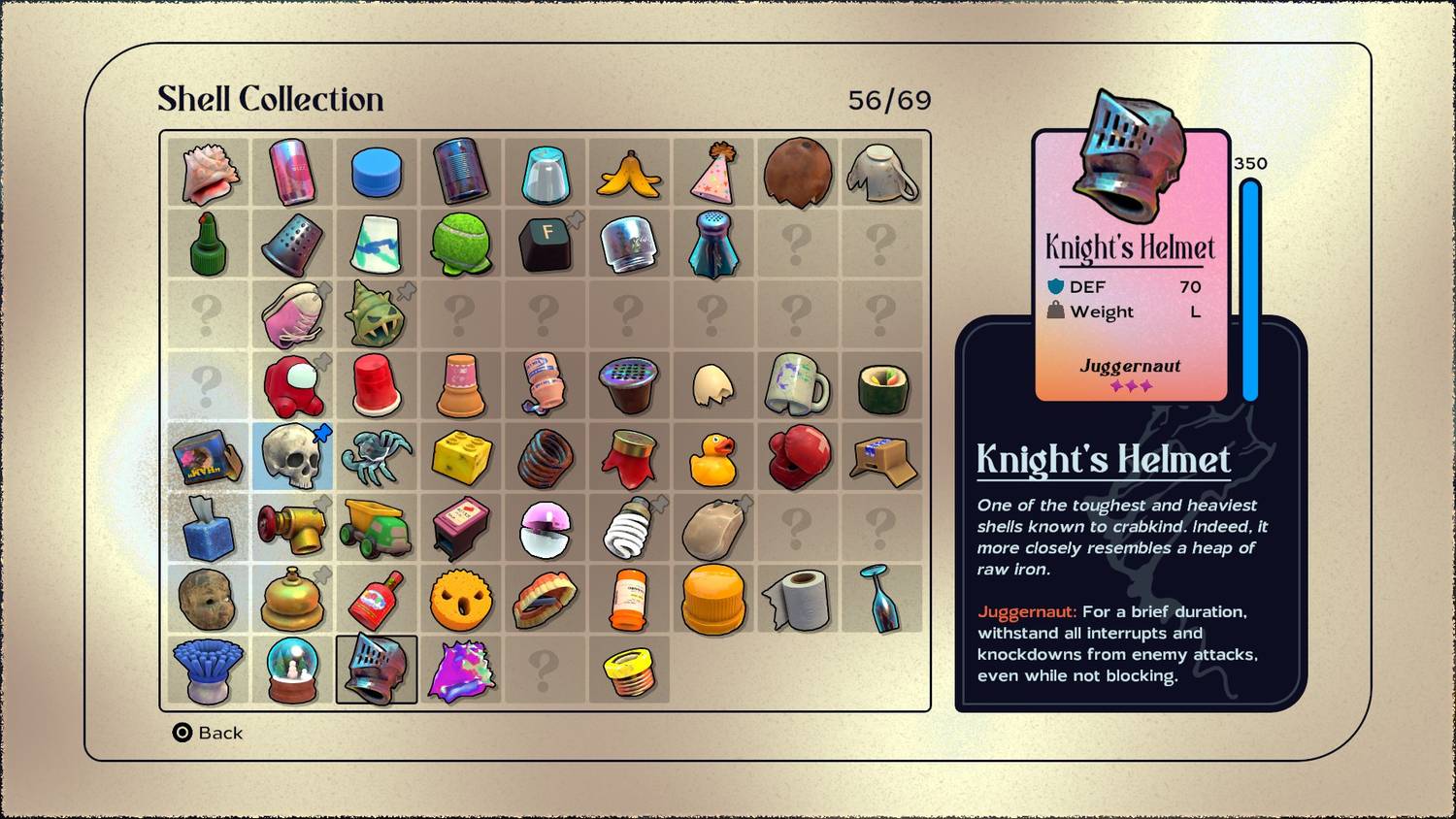 El casco de caballero es uno de los raros caparazones en El tesoro de otro cangrejo ya que solo se puede encontrar en una ubicación. Mientras explora el Viejo Océano, Kril puede viajar fuera de los caminos trillados y completar un pequeño rompecabezas que involucra crema de afeitar y esponjas para llegar al Casco de Caballero. Este Shell, aunque pesado, ofrece algunas de las mejores defensas y durabilidad de todo el juego y es una referencia notable a la inspiración del juego. Almas oscuras. Desafortunadamente, la habilidad Juggernaut no es única ya que está disponible en Shells anteriores, pero aún así es notable.