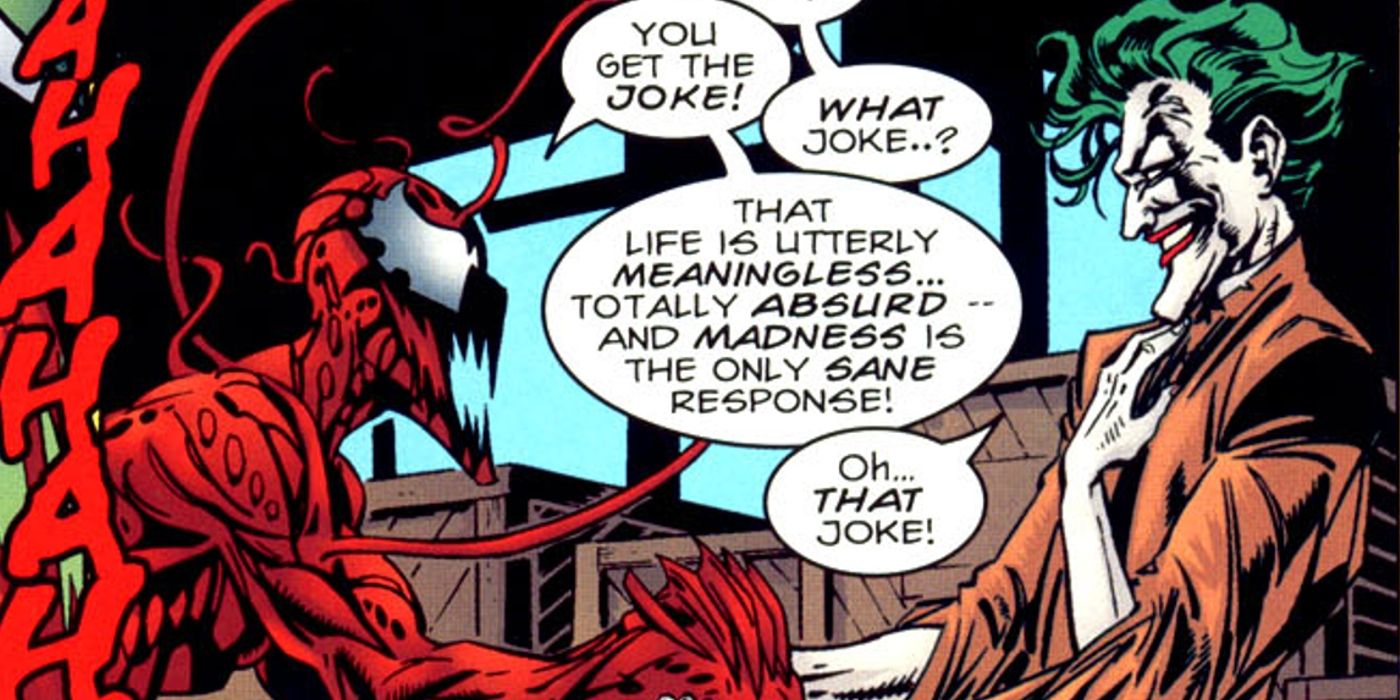 Sin embargo, traer a Carnage y al Joker inicia una guerra entre los dos que solo puede resolverse si Spider-Man y Batman unen fuerzas para evitar que sus enemigos sedientos de sangre destruyan Gotham City para siempre. Esta historia vale la pena solo por las escenas del Joker y Carnage.