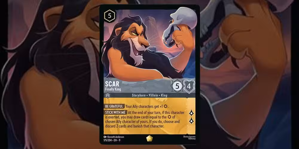 Scar permite que todos los personajes aliados obtengan una fuerza de +1, y si Scar se ejerce al final de tu turno, puedes robar cartas iguales a la fuerza de desafío de una de tus cartas de personaje aliado, aunque debes descartar dos cartas y desterrar ese personaje.