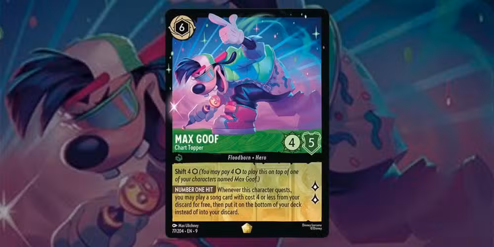 “Max Goof – Chart Topper” es impresionante a la vista, pero también una adición realmente increíble a una baraja. Se puede cambiar por cuatro, lo que lo hace más barato de jugar, y te permite jugar una carta de canción de costo cuatro o menos de forma gratuita cada vez que realiza una misión. Luego, esa canción se agrega al final de tu mazo en lugar de descartarse.