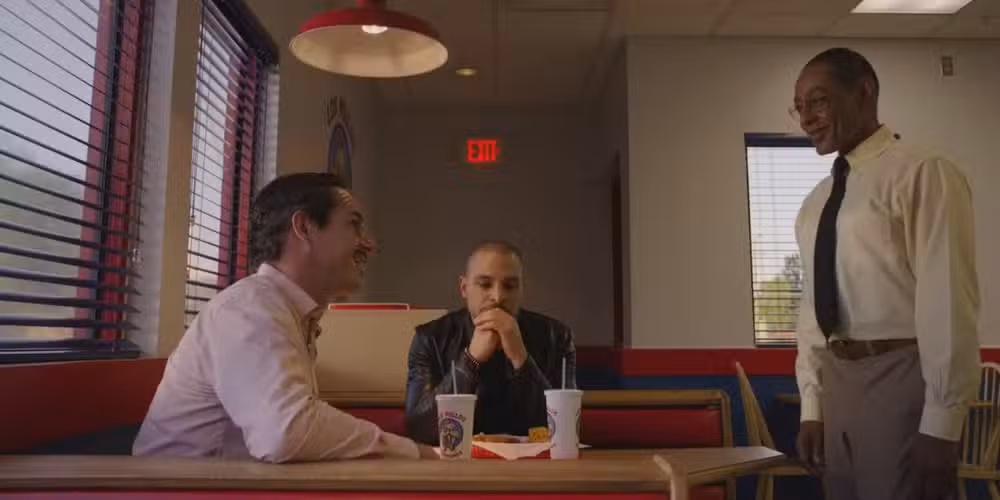 Durante la mayor parte de su primera reunión, Lalo mantiene su disposición externa soleada, y Gus mantiene la calma de su característica. Incluso mientras discuten un asesinato en sus intereses mutuos, el tono rara vez es menos que agradable. Solo el menos indicio de malicia del lado de Lalo implica el rival que pronto compartirán, lo que aumenta la tensión para la temporada y la mitad por venir.