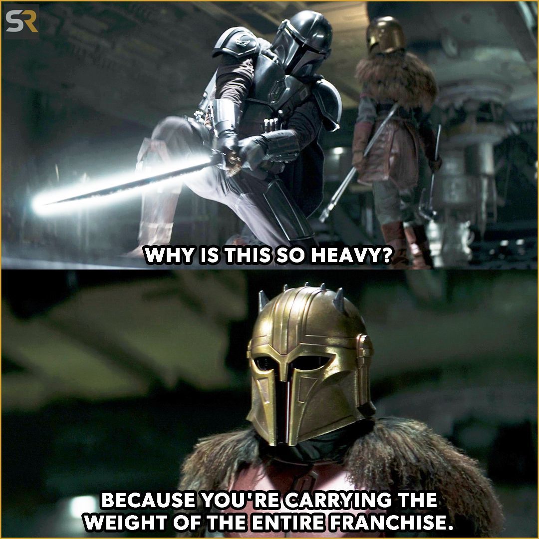Guerra de las Galaxias quedó a la deriva tras el lanzamiento de El ascenso de Skywalkerpero la llegada de la serie extremadamente popular el mandaloriano le dio a la franquicia una nueva dirección en la pantalla chica. Este meme hace referencia al programa y específicamente al misterioso Darksaber que maneja Din Djarin. El meme es aún más divertido para aquellos que saben por qué Darksaber se vuelve más pesado en combate y hace referencia al hecho de que la inmensa popularidad de el mandaloriano no solo le ha dado nueva vida a la franquicia, sino que también ha llevado a cabo por sí solo Guerra de las Galaxias‘ éxito sobre sus hombros en los últimos años.