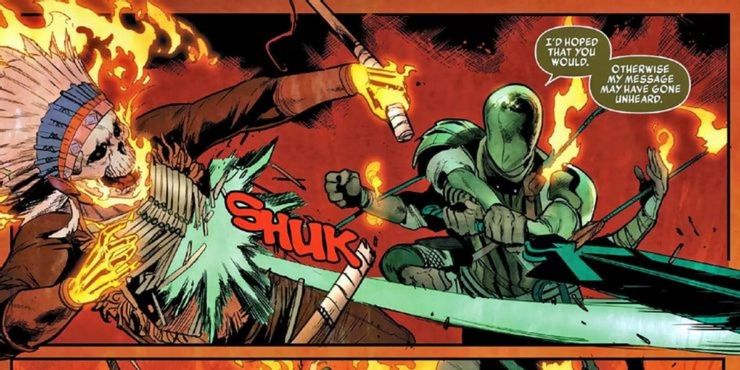 Lo que siempre ha sido un concepto divertido dentro del mito de Ghost Rider es encontrar varias encarnaciones del espíritu de venganza a lo largo del tiempo y el espacio. Los lectores han visto de todo, desde camioneros hasta espíritus con nunchaku. Entonces, ver a un Ghost Rider nativo americano luchando contra la misteriosa Necrosis del otro mundo es instantáneamente una sensación visual.