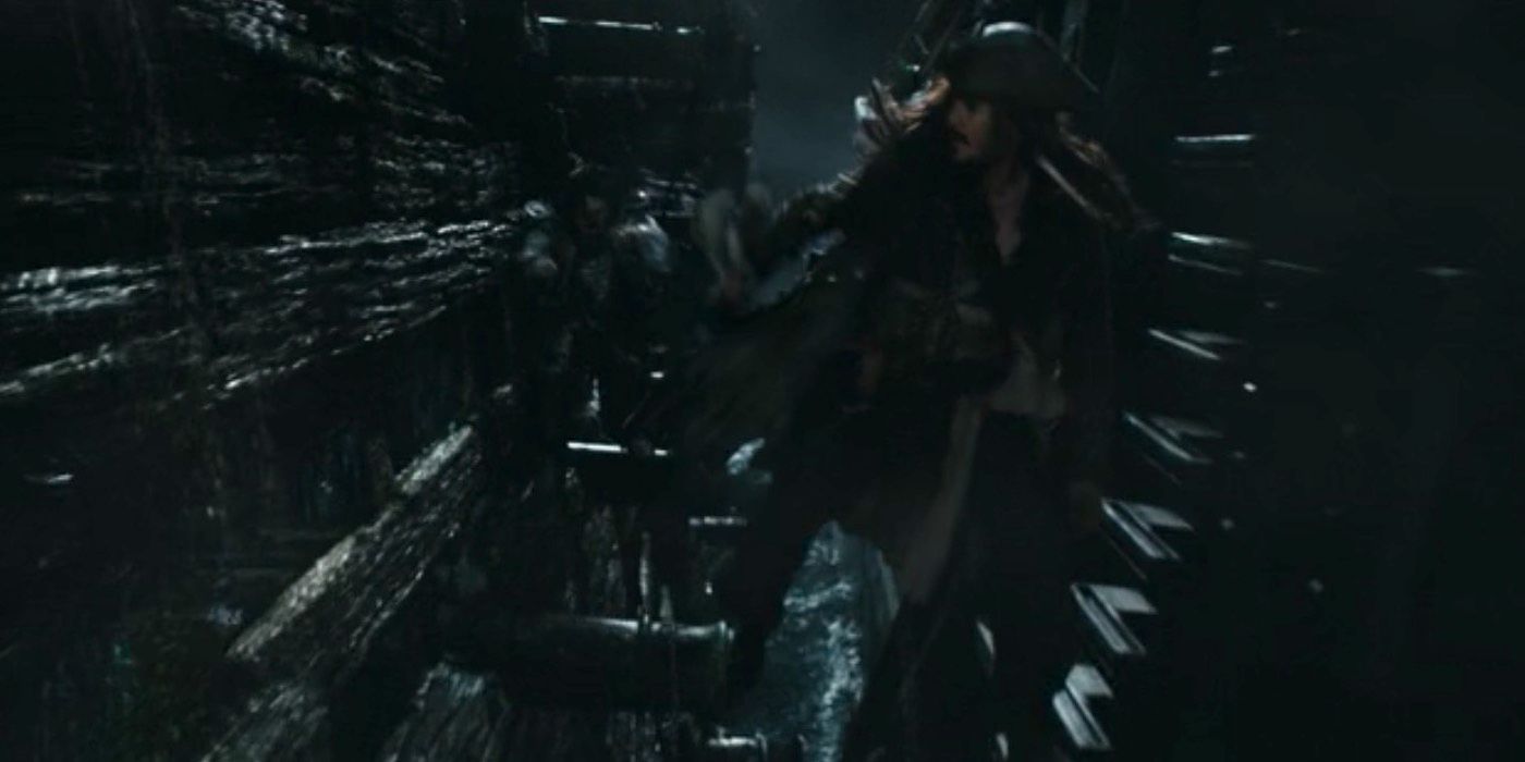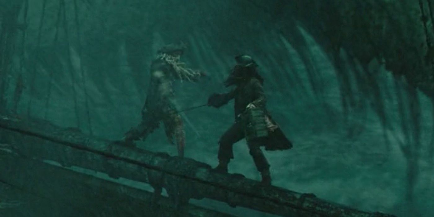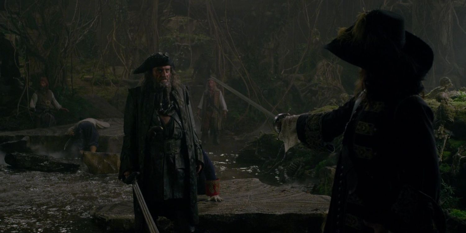 Una de las peleas más clásicas de la franquicia proviene de la primera película, La maldición de la Perla Negro, en el que Jack y Barbossa tienen un acalorado duelo en la cueva de la Isla de Muerta. En este punto de la historia, ambos hombres son inmortales porque la maldición aún no ha sido levantada. Sin embargo, su duelo sigue siendo tremendamente emocionante y su rápido intercambio de golpes está realizado con mucho cuidado para que parezca convincente. Si bien puede que no sea la mejor pelea de la franquicia, el diálogo de Jack y Barbossa durante la pelea eleva enormemente la escena.