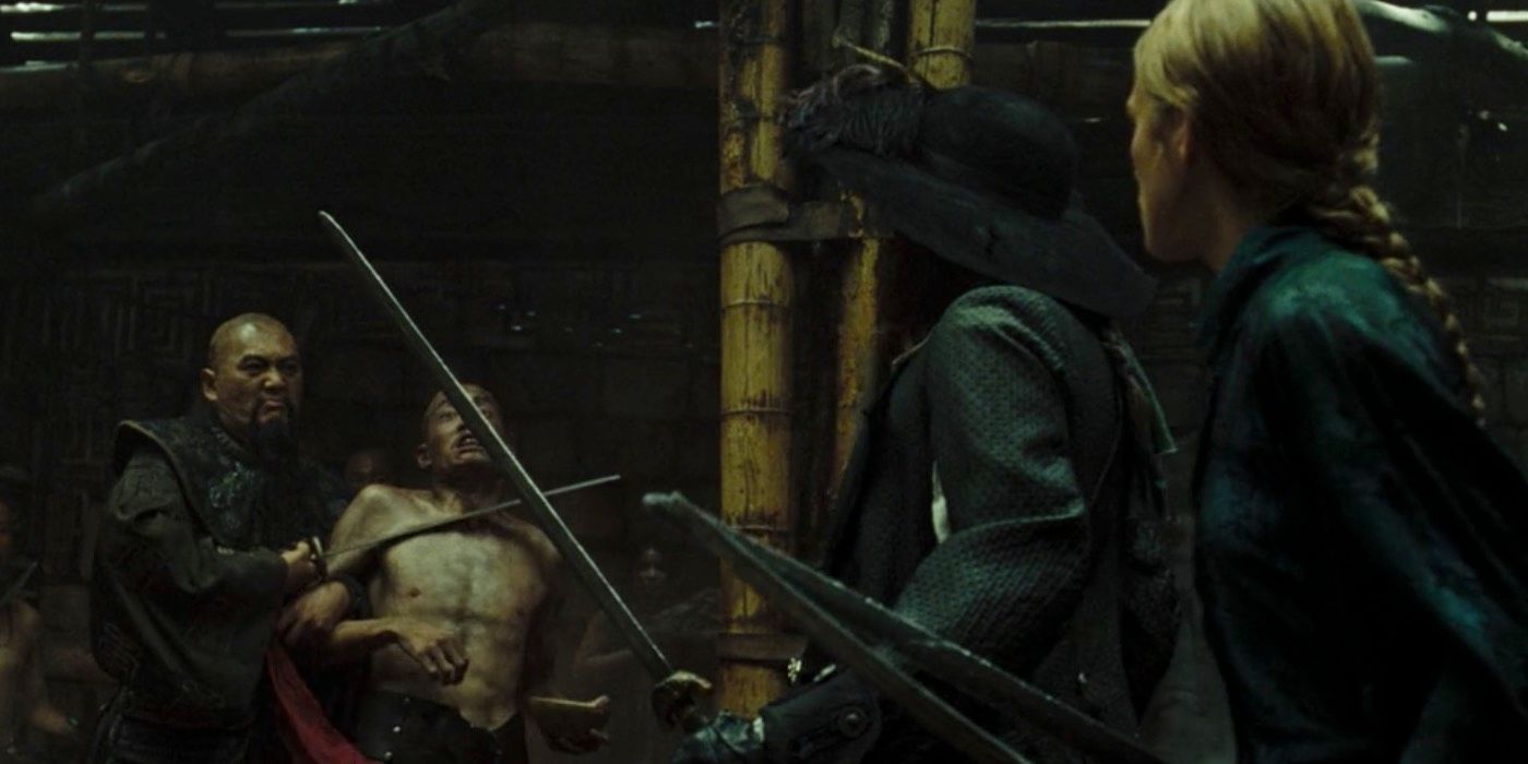 Este enfrentamiento épico de Al final del mundo Tiene lugar al principio de la película cuando Will, Elizabeth y Barbossa quedan atrapados en una pelea con soldados británicos mientras intentan encontrar información sobre cómo rescatar a Jack de la Tierra de los Muertos. Esta lucha es amplia y emplea todo tipo de armas, incluidas espadas. Esta es una de las peleas más emocionantes de la franquicia debido al gran alcance de la lucha. Elizabeth y Will se distinguen mientras mantienen a raya a los británicos y logran escapar. Con acrobacias fantásticas y mucha acción, esta es fácilmente una de las mejores peleas de la serie.
