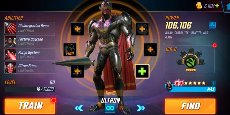 Ultron es la recompensa por vencer a Dark Dimension 2, y su nivel de poder relativo en comparación con sus contemporáneos honra su reputación como uno de los villanos más poderosos del Universo Marvel. Su habilidad para invocar bots de Ultrón lo ayudó a abrumar a los equipos enemigos, y su habilidad máxima infligió un daño sin precedentes para su época.