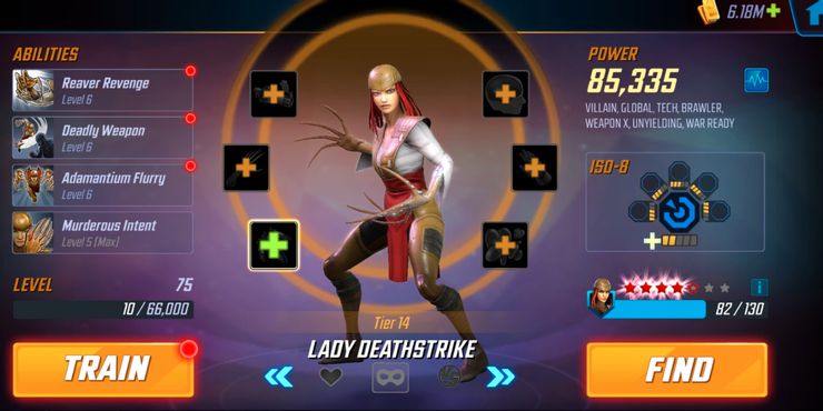 Lady Deathstrike se mejora a sí misma con Deathproof y otras condiciones positivas cuando su salud baja, por lo que a menudo sobrevive más de lo que parece. Esta ventaja le ha valido un lugar en los equipos Doom Raid de muchos jugadores para los nodos tecnológicos, y sus requisitos de equipo barato la convierten en una opción atractiva para Dark Dimension.