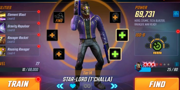 La característica más singular de este Star-Lord es que puede robar energía de habilidad de otros personajes. Nadie más en el juego puede hacer esto actualmente, y es fundamental para ralentizar a los enemigos con un tiempo de reutilización alto como Doctor Doom. T’Challa también tiene requisitos de equipo baratos, por lo que muchos jugadores lo están trayendo a Dark Dimension.