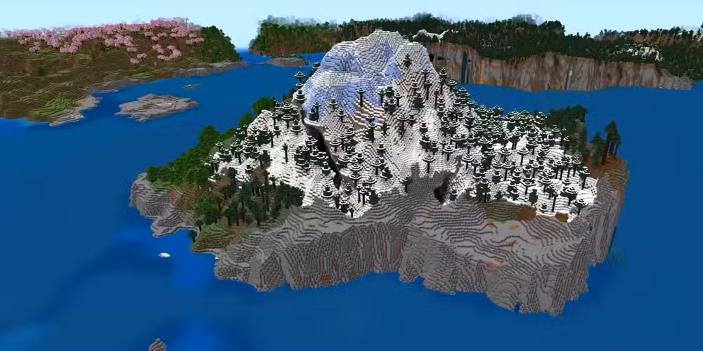 Esta semilla te coloca en medio de un enorme lago, con una isla masiva en su centro. Este la isla alberga un solo bioma de montaña solitario en Minecrafthaciéndolo perfecto para una base justo en su pico. Desde la parte superior de este lugar, su base puede examinar toda la tierra circundante, o incluso actuar como un faro cuando regresa de largas expediciones.