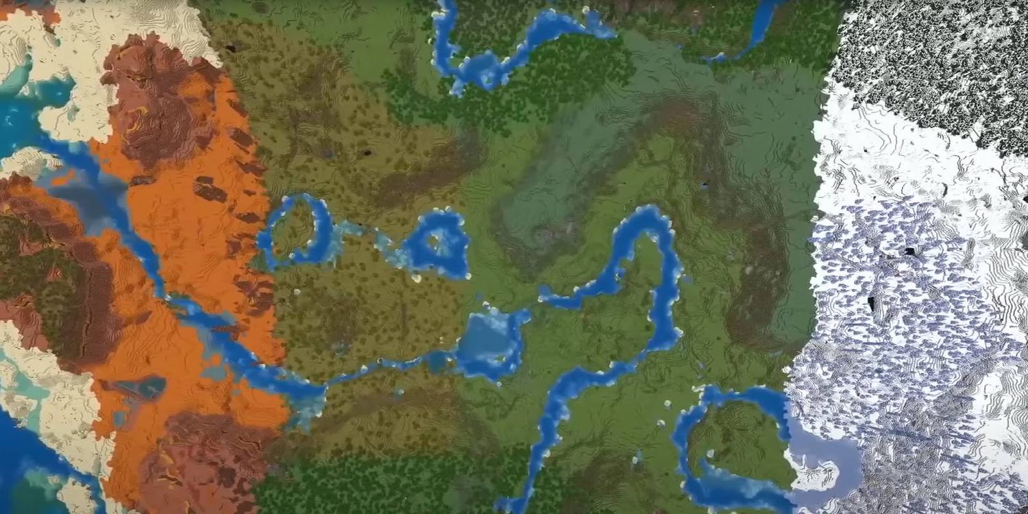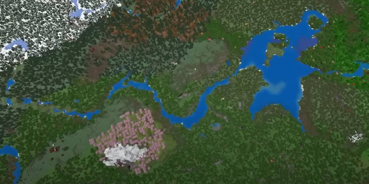 Uno de los mayores desafíos de las semillas de Survival con toneladas de biomas es la gran cantidad de tiempo que lleva viajar a cada lugar importante. Afortunadamente, este mundo ofrece una solución fácil a este problema, con una vasto río conectando casi todos los entornos de Minecraft. Además Naufragio y una interesante colección de flor de cerezo Los árboles dentro de una montaña helada cerrada te brindan algunas ventajas con las que trabajar cuando engendras.